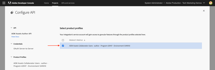 Verknüpfen Sie ihn mit dem neu hinzugefügten Produktprofil für AEM Assets-Mitarbeiter-Benutzende – Autorin/Autor – Programm XXX – Umgebung XXX oder jedem anderen Produktprofil, das Sie für den Zugriff auf die AEM Assets-API verwenden möchten.
