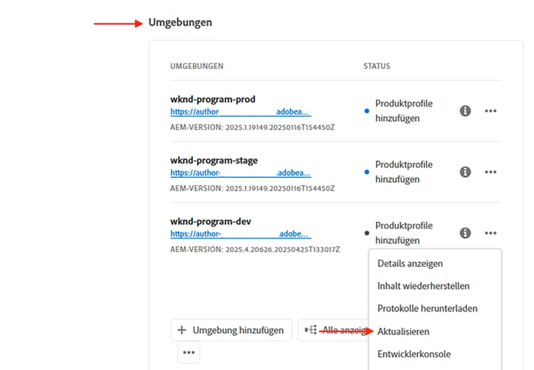 - Um die AEM-Instanz zu aktualisieren, navigieren Sie nach der Anmeldung bei der Adobe Cloud Manager zum Abschnitt Umgebungen, wählen Sie das Symbol Auslassungspunkte neben dem Umgebungsnamen aus und klicken Sie auf Aktualisieren Option.