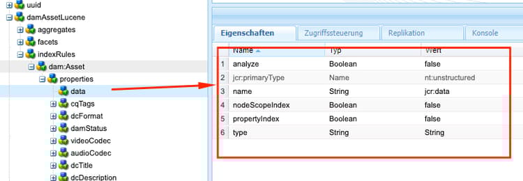 damAssetLuceneundcqPageLucene. - Alle Indexdefinitionen werden im Repository unter dem Knoten