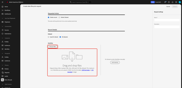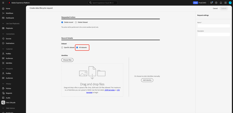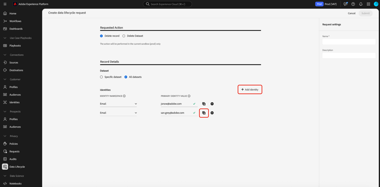 Verwenden Sie den Data Lifecycle Arbeitsbereich um Datensätze in Adobe Experience Platform basierend auf ihren primären Identitäten zu löschen. Diese Datensätze können mit einzelnen Verbrauchern oder jeder anderen Entität verknüpft werden, die im Identitätsdiagramm enthalten ist.