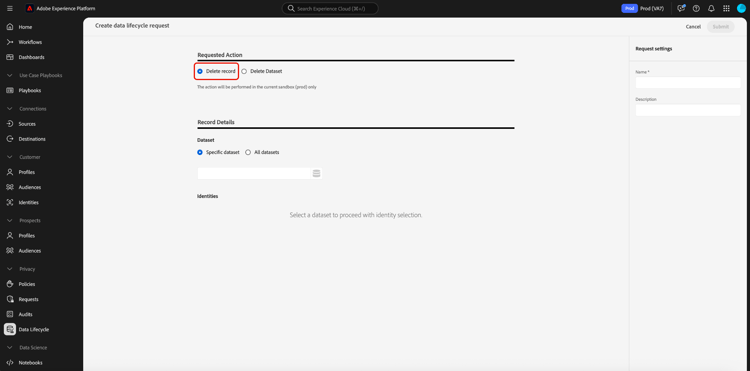 Der Workflow zur Anfrageerstellung wird angezeigt. Standardmäßig ist die Option Delete record im Abschnitt Requested Action ausgewählt. Lassen Sie diese Option aktiviert.