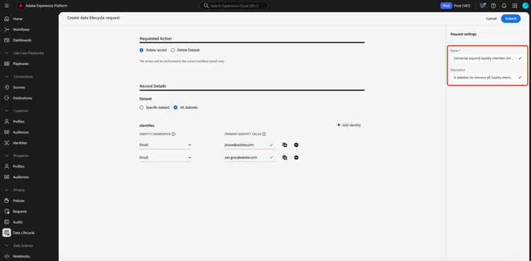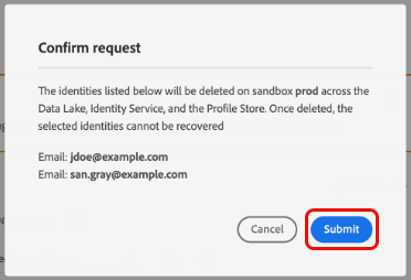 Es erscheint ein Confirm request Dialogfeld, das anzeigt, dass die Identitäten nach dem Löschen nicht wiederhergestellt werden können. Wählen Sie Submit aus, um die Liste der Identitäten zu bestätigen, deren Daten Sie löschen möchten.