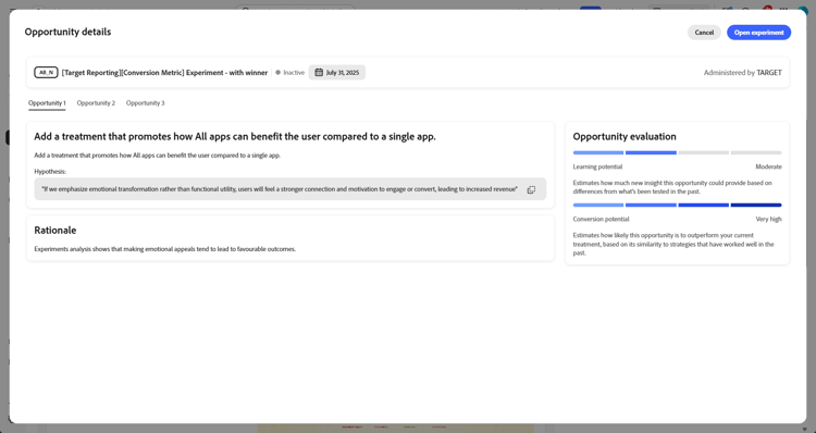 Wenn Sie eine Opportunity auswählen, wird das Fenster Opportunity-Details geöffnet, in dem eine bestimmte von Journey Optimizer Experimentation Accelerator vorgeschlagene Abwandlung oder Variante beschrieben wird. Zu dieser Ansicht gehören:
