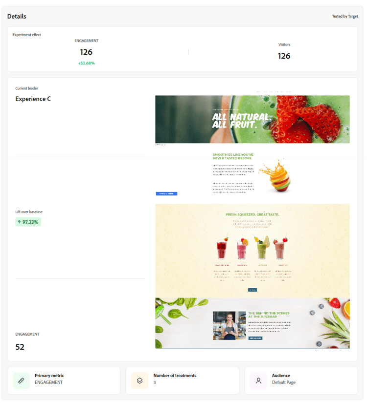Das Resultat des Experiments bietet Ihnen einen schnellen Überblick über die erfolgreichste Variante in Ihrem Experiment.