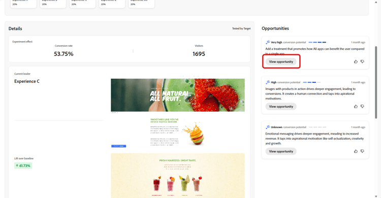 Innerhalb der Experimentansicht können Sie auf dieselben KI-gestützten Experiment-Opportunities zugreifen, die auch von Journey Optimizer Experimentation Accelerator angezeigt werden.
