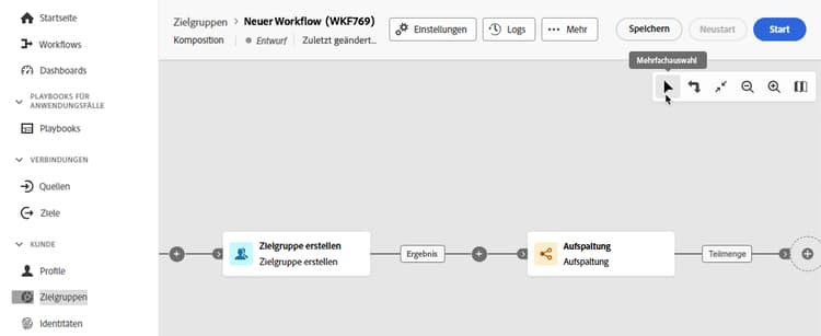 Mit der Komposition föderierter Zielgruppen können Sie Kompositionen erstellen. Dabei können Sie verschiedene Aktivitäten in einer visuellen Arbeitsfläche nutzen, um Zielgruppen zu erstellen. Die so erstellten Zielgruppen werden in Adobe Experience Platform gespeichert und können in Experience Platform-Zielen und Adobe Journey Optimizer zum Ansprechen von Kundschaft genutzt werden.