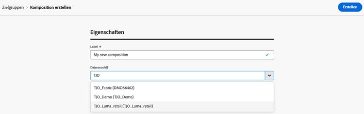 Geben im Abschnitt einen Titel für Ihre Komposition an und wählen Sie ein Datenmodell aus. In den Aktivitäten Ihrer Komposition sind nur die mit diesem Datenmodell verknüpften Schemata verfügbar.