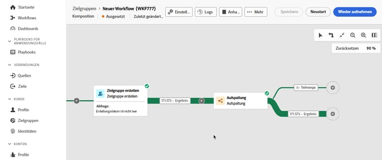 Wenn die Komposition ausgeführt wird, wird jede Aktivität auf der Arbeitsfläche in sequenzieller Reihenfolge ausgeführt, bis das Ende der Komposition erreicht ist. Anhand eines visuellen Flusses können Sie den Fortschritt von Zielgruppenprofilen in Echtzeit verfolgen. Auf diese Weise können Sie den Status jeder Aktivität und die Anzahl der Profile, die zwischen ihnen wechseln, schnell identifizieren.