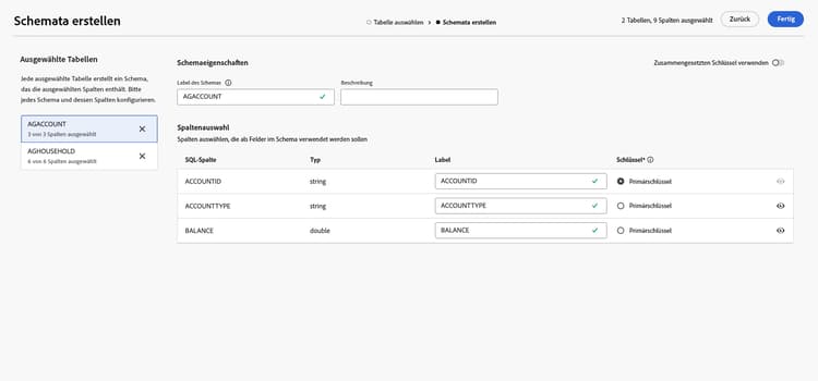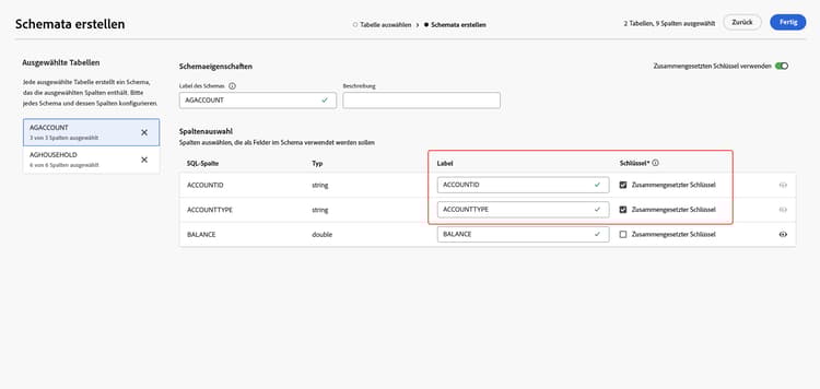 Jede ausgewählte Tabelle generiert ein Schema mit den ausgewählten Spalten. Für jede Tabelle können Sie das Label des Schemas ändern, eine Beschreibung hinzufügen, den Feldtitel umbenennen, die Sichtbarkeit des Feldtitels festlegen und den Primärschlüssel für das Schema auswählen.