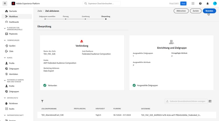 Überprüfen Sie die Zielkonfiguration und die Zielgruppeneinstellungen und wählen Sie dann Beenden aus.