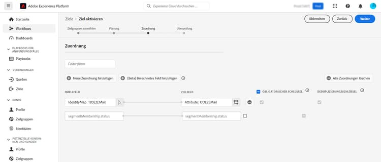 Legen Sie im Schritt Zuordnung fest, welche Attribute und Identitätsfelder für Ihre Zielgruppe(n) exportiert werden sollen. Weitere Informationen finden Sie in der Dokumentation zu Adobe Experience Platform unter Zuordnungsschritt.