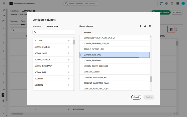 Wählen Sie die Schaltfläche Spalten konfigurieren aus, um die Datenanzeige zu ändern.