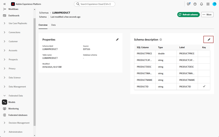 Tabellen in einer föderierten Datenbank können aktualisiert, hinzugefügt oder entfernt werden. Sie müssen dann das Schema in Adobe Experience Platform aktualisieren, um es an die neuesten Änderungen anzupassen. Wählen Sie dazu das
