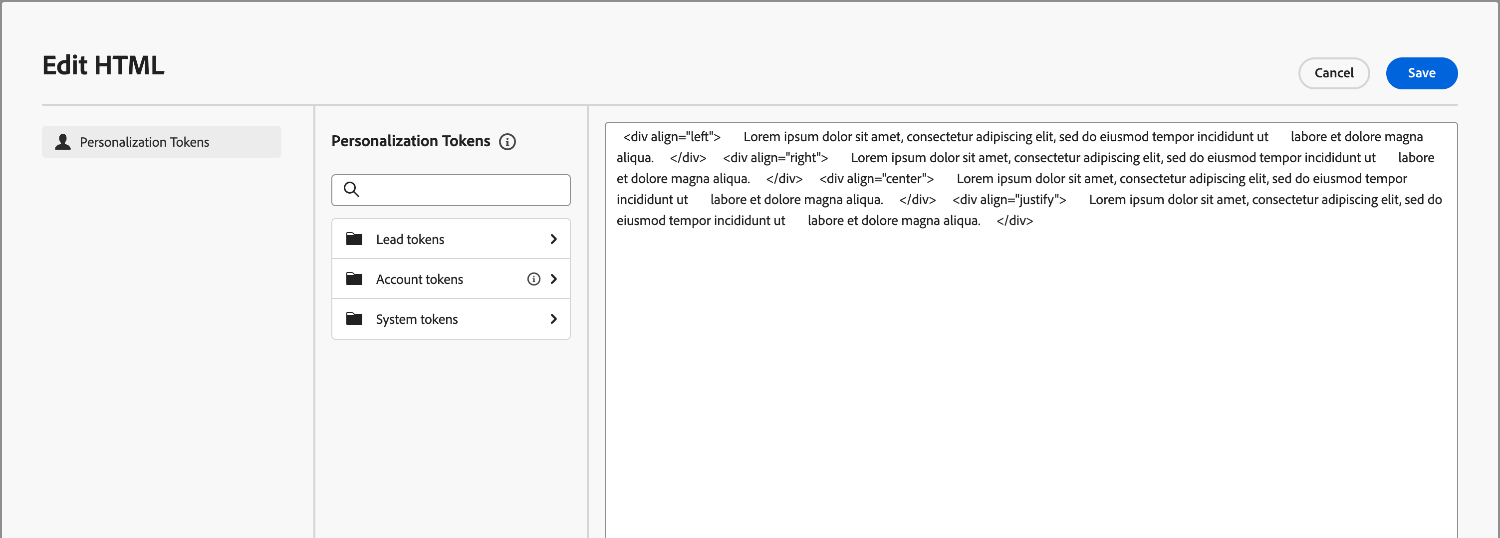 Verwenden Sie die Komponente Text , um einen Textblock in Ihren Inhalt einzufügen. Wenn die Textkomponente auf der Arbeitsfläche ausgewählt ist, geben Sie den Text ein und verwenden Sie die Symbolleistenoptionen, um Inline-Formatierung und Optionen hinzuzufügen, einschließlich Personalisierungs-Token und bedingter Varianten.