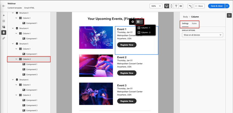 Im folgenden Beispiel werden Schritte zum Anpassen des Abstands und der vertikalen Ausrichtung innerhalb einer Strukturkomponente mit Spalten beschrieben.