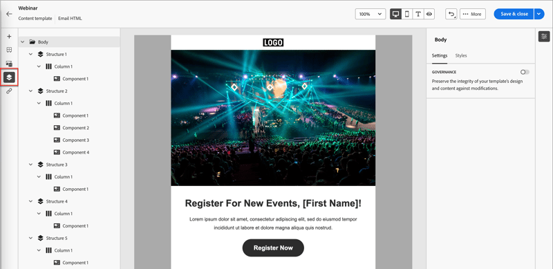 Wenn Sie beispielsweise ein wiederverwendbares Banner mit einer anklickbaren Schaltfläche entwerfen, können Sie den URL-Parameter für die Schaltfläche als bearbeitbar festlegen. E-Mail-Autoren können dann eine URL verwenden, die spezifischer für ihre E-Mail-Kampagne ist. Mit diesen anpassbaren Feldern können Marketing-Experten wiederverwendbare Inhalte verwalten und personalisieren, ohne völlig neue Inhaltsbausteine erstellen oder die vom ursprünglichen Fragment übernommenen Aktualisierungen unterbrechen zu müssen.