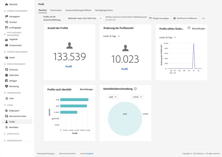 Mit dem Echtzeit-Kundenprofil in Adobe Journey Optimizer erhalten Sie eine ganzheitliche Sicht auf jeden einzelnen Kunden, indem Sie Daten aus verschiedenen Kanälen, wie Online-, Offline-, CRM- und Drittanbieter-Daten, miteinander kombinieren. Mit dem Profil können Sie Ihre Kundendaten in einer zentralen Ansicht zusammenführen, die eine aussagekräftige Darstellung jeder Kundeninteraktion mit Zeitstempel bietet.