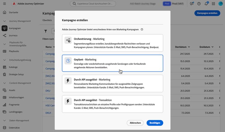 Klicken Sie auf die Schaltfläche Kampagne erstellen und wählen Sie den Kampagnentyp Geplant – Marketing aus.