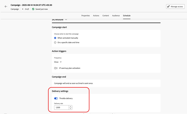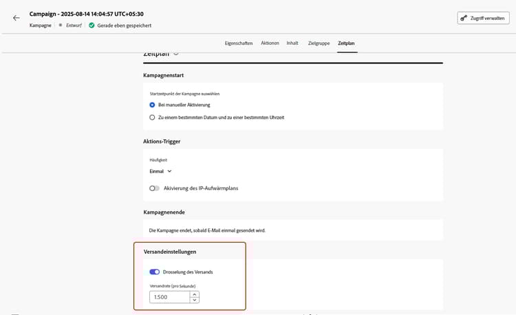 Um die Versandrate zu steuern, aktivieren Sie die Option Versand drosseln im Abschnitt Versandeinstellungen und geben Sie die gewünschte Versandrate pro Sekunde an.