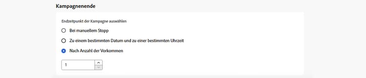 Im Abschnitt Kampagnenende können Sie angeben, wann die Ausführung einer Kampagne gestoppt werden soll. Außerhalb der angegebenen Daten wird die Kampagne nicht ausgeführt.