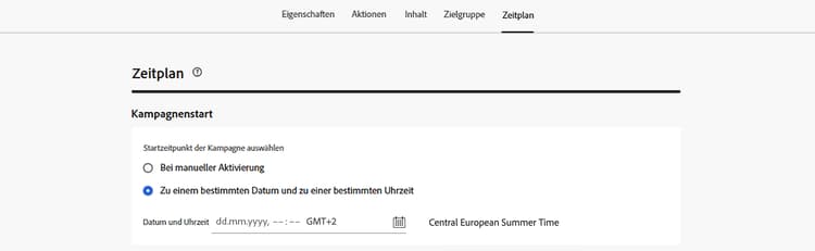 Wenn Sie Ihre Kampagne nicht direkt nach der Aktivierung ausführen möchten, können Sie das Datum und die Uhrzeit für den Versand der Nachricht im Abschnitt Kampagnenstart angeben.