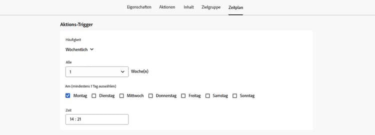 Bei E-Mail-, SMS- und Push-Benachrichtigungs-Aktionen können Sie festlegen, mit welcher Häufigkeit die Nachricht der Kampagne gesendet werden soll. Verwenden Sie dazu die Option Aktions-Trigger im Bildschirm zur Kampagnenerstellung, um festzulegen, ob die Kampagne täglich, wöchentlich oder monatlich ausgeführt werden soll.