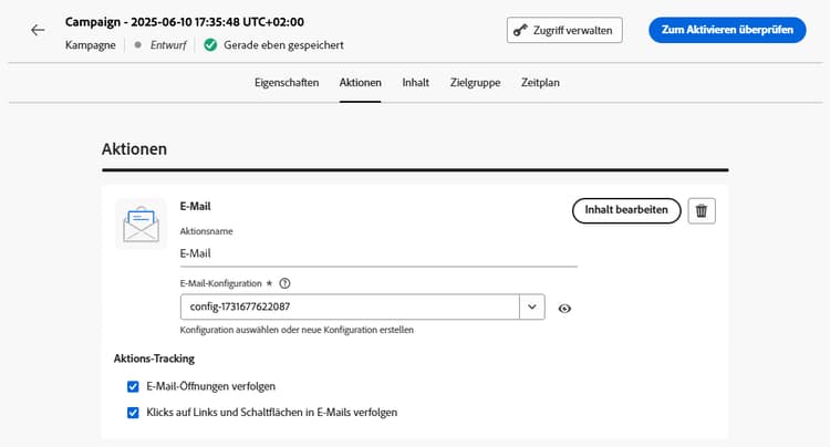 Verwenden Sie die Registerkarte Aktionen, um eine Kanalkonfiguration für Ihre Nachricht auszuwählen und um zusätzliche Einstellungen wie Tracking, Inhaltsexperimente oder mehrsprachige Inhalte zu konfigurieren.