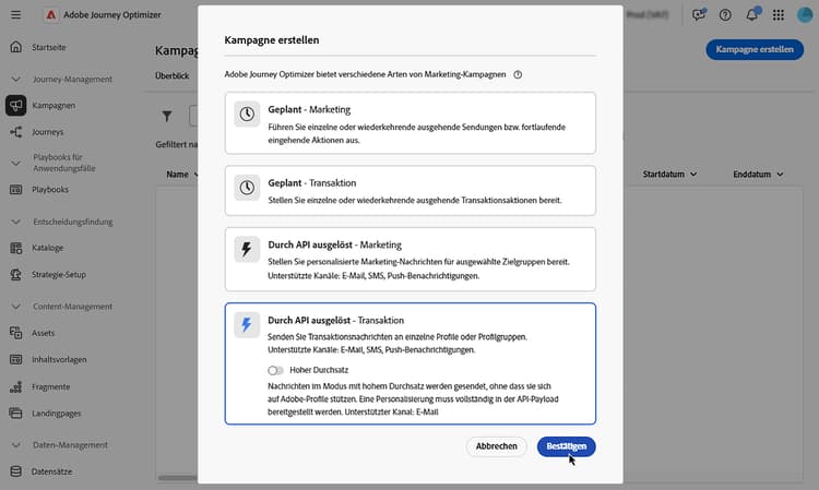 API-ausgelöst – Marketing – Wählen Sie diesen durch API ausgelösten Kampagnentyp aus, um personalisierte Marketing-Kommunikation an ausgewählte Zielgruppen zu senden.