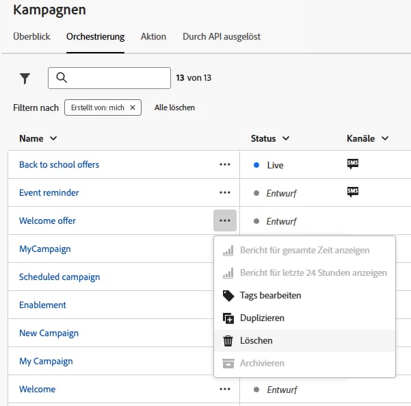 Zu jeder orchestrierten Kampagne in der Liste werden Informationen angezeigt, beispielsweise der aktuelle Status der Kampagne, der zugehörige Kanal und zugehörige Tags oder der Zeitpunkt der letzten Änderung. Sie können die angezeigten Spalten anpassen, indem Sie auf die Schaltfläche
