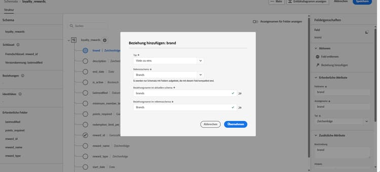 Erstellen Sie dann eine Beziehung zwischen dem Schema Treueprämien und dem Schema Marken, um jeden Prämieneintrag mit der entsprechenden Marke zu verknüpfen.