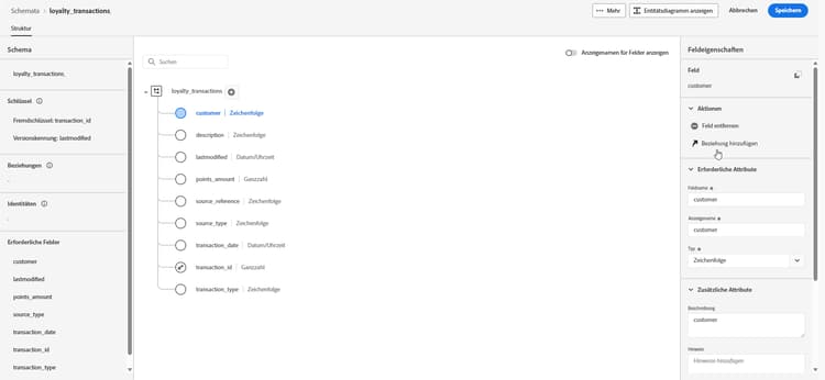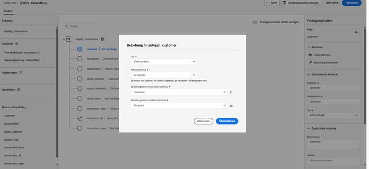 Klicken Sie auf Beziehung hinzufügen in den Feldeigenschaften der Kundinnen und Kunden.