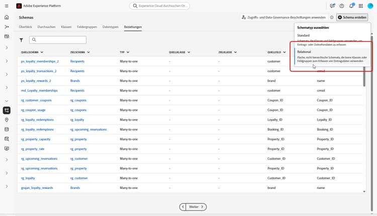 Erstellen Sie zunächst manuell ein neues relationales Schema in Adobe Experience Platform. Dabei können Sie die Schemastruktur von Grund auf neu definieren, einschließlich des Namens und Verhaltens.