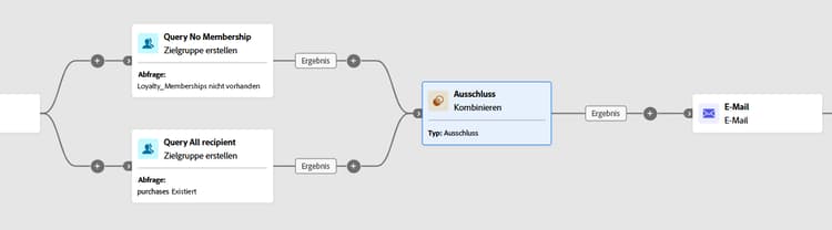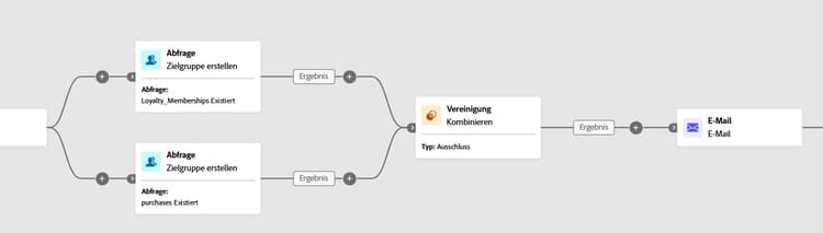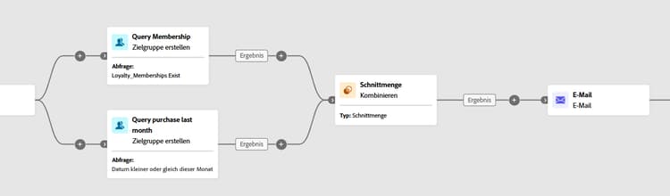 Das folgende Beispiel zeigt die Verwendung der Schnittmenge der zwei Abfrageaktivitäten. Sie wird verwendet, um Profile zu identifizieren, die Mitglieder des Treueprogramms sind und innerhalb des letzten Monats einen Kauf getätigt haben.