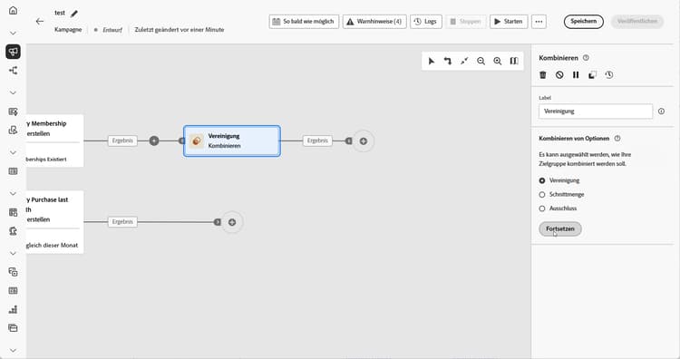 Vereinigung: Fügt die Ergebnisse mehrerer Aktivitäten zu einer einheitlichen Zielgruppe zusammen.