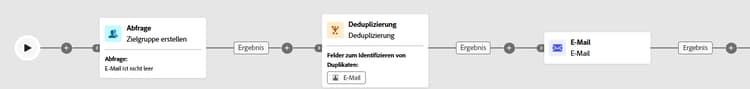 Im folgenden Beispiel wird eine Aktivität des Typs Deduplizierung verwendet, um doppelte Einträge aus der Zielgruppe zu entfernen, bevor ein Versand durchgeführt wird. Die Zielgruppe wird zunächst so gefiltert, dass nur Profile mit einem ausgefüllten E-Mail-Feld einbezogen werden. Anschließend verwendet die Aktivität Deduplizierung die E-Mail-Adresse, um Duplikate zu ermitteln und auszuschließen.