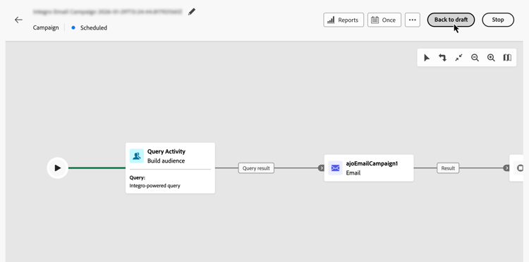 Um eine Kampagne wieder in den Entwurfsstatus zu versetzen, öffnen Sie die orchestrierte Kampagne und klicken Sie auf die Schaltfläche Zurück zum Entwurf in der Symbolleiste der Kampagnen-Arbeitsfläche.