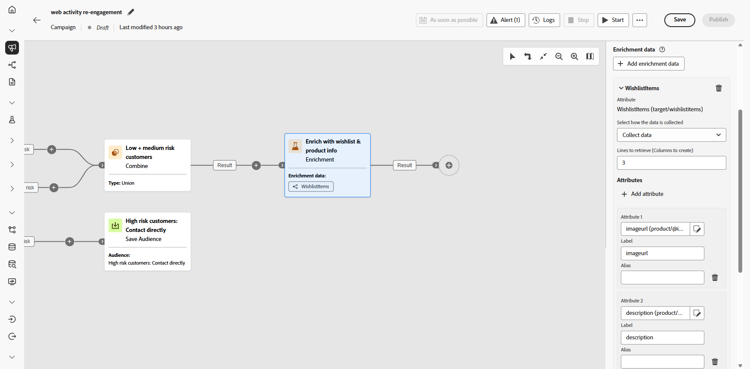 Fügen Sie eine Aktivität des Typs Anreicherung hinzu, um die Kampagne mit Wunschliste und Produktinformationen zu personalisieren.