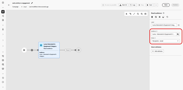 Fügen Sie eine Aktivität des Typs Zielgruppe lesen hinzu, um eine vordefinierte Zielgruppe aus Adobe Experience Platform auszuwählen, d. h. Kundinnen und Kunden, die die Kategorie „Trainingsgeräte“ auf Ihrer Website durchsucht haben.