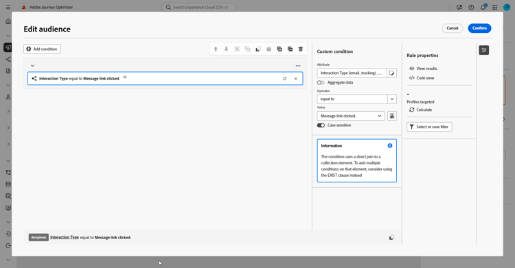Hier erstellen wir eine Zielgruppe basierend auf E-Mail-Klickereignissen, um alle Personen erneut anzusprechen, die mit einer zuvor gesendeten E-Mail interagiert haben und auf einen Link in dieser Nachricht geklickt haben.