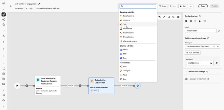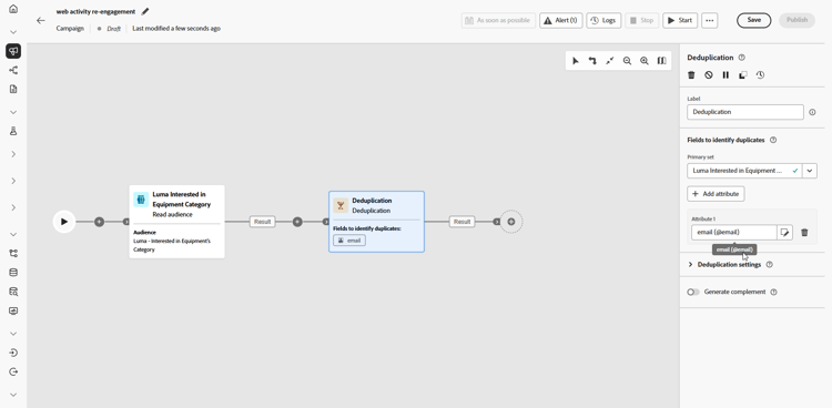 Fügen Sie eine Aktivität des Typs Deduplizierung hinzu, um doppelte E-Mail-Adressen aus Ihrer Zielgruppe zu entfernen, sodass jede Person nur eine Nachricht erhält.