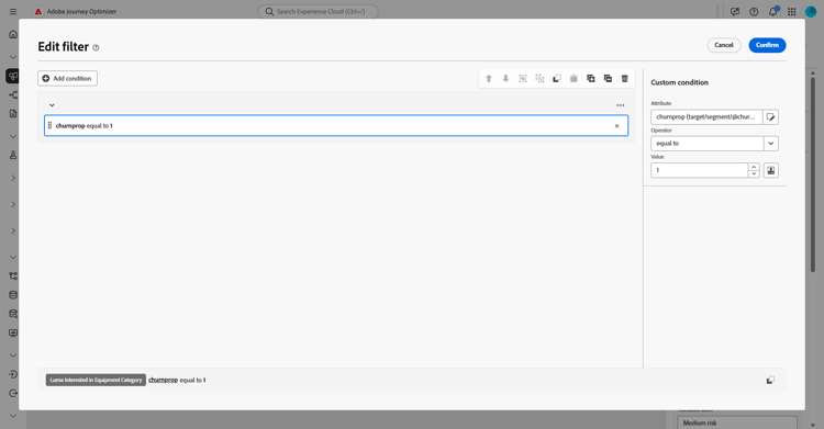 Erstellen Sie ein dediziertes Zielgruppensegment für Kundinnen und Kunden, bei denen ein hohes Abwanderungsrisiko besteht. Diese Zielgruppe wird später für eine separate, zielgerichtete Kommunikation verwendet.