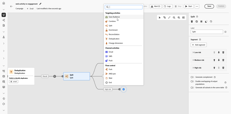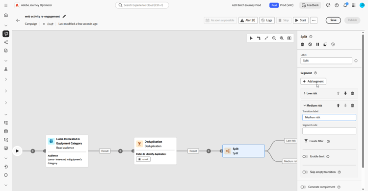 Als Nächstes fügen Sie eine Aktivität des Typs Aufspaltung hinzu, um Kundinnen und Kunden nach ihrer Abwanderungswahrscheinlichkeit zu segmentieren, sodass Sie personalisierte Erlebnisse bereitstellen können, die auf jede Kundengruppe zugeschnitten sind.