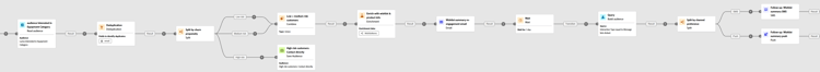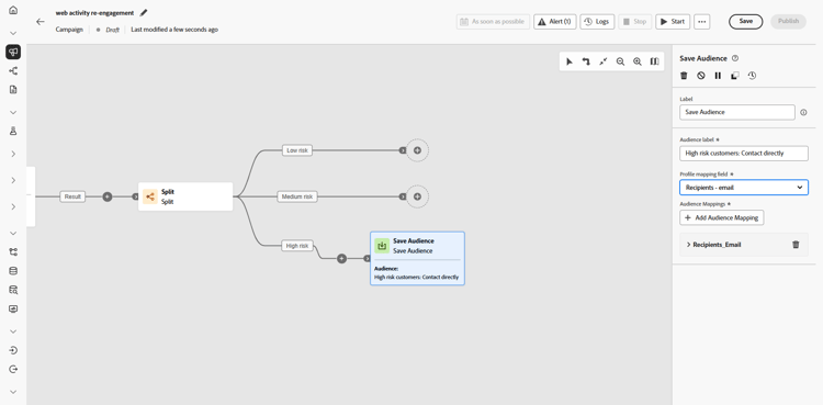 Kundinnen und Kunden mit hohem Risiko werden in einer separaten neuen Zielgruppe zusammengefasst, die später für eine bestimmte Kommunikation verwendet wird, während Kundinnen und Kunden mit niedrigem und mittlerem Risiko eine mehrstufige Journey mit personalisierten E-Mails und Folgenachrichten durchlaufen.