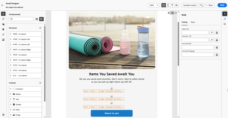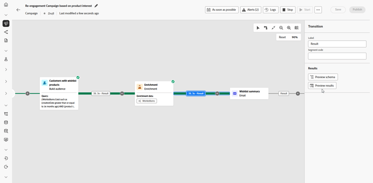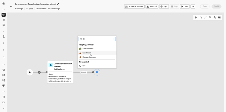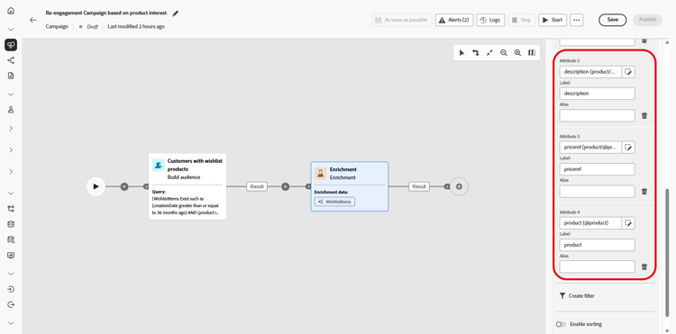 Fügen Sie eine Aktivität des Typs Anreicherung hinzu, um die Kampagne mit Wunschliste und Produktinformationen zu personalisieren.