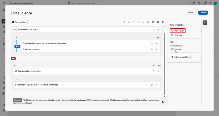 Klicken Sie auf Berechnen, um die Anzahl der von diesen Bedingungen betroffenen Profile anzuzeigen, und wählen Sie Ergebnisse anzeigen aus, um Details für jede Bedingung zu überprüfen und zu bestätigen, dass die Zielgruppe Ihrem Zielsegment entspricht.