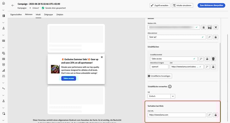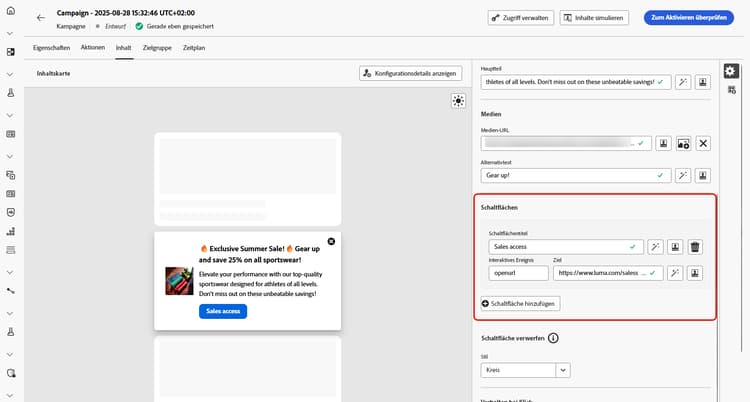 Geben Sie in das Feld Ziel die Web-URL oder den Deeplink ein, an den die Benutzenden nach der Interaktion mit der Schaltfläche weitergeleitet werden sollen.
