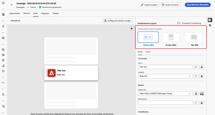 Wählen Sie im Abschnitt Inhaltskarten-Layout eine der drei Optionen für das Bild-Layout aus, je nach Ihren Messaging-Anforderungen.