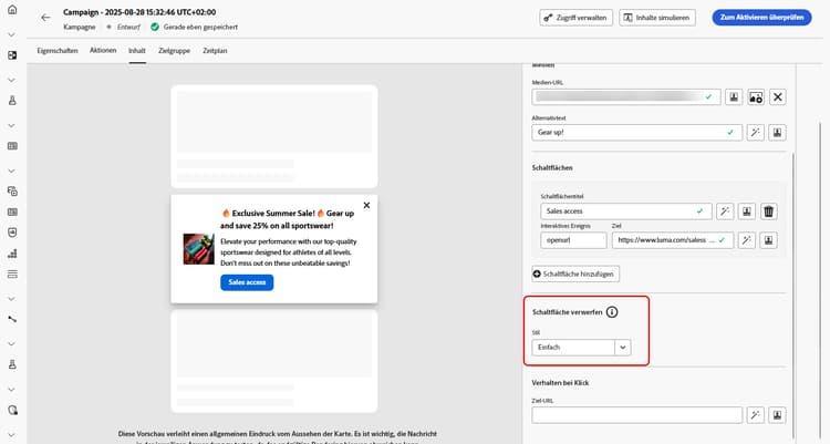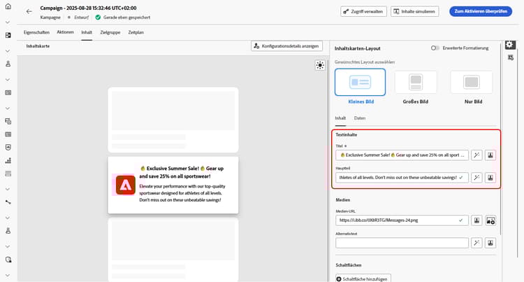 Geben Sie in das Feld Ziel-URL die Web-URL oder den Deeplink ein, die bzw. der die Benutzenden nach der Interaktion mit Ihrer Inhaltskarte an das gewünschte Ziel weiterleitet. Dabei kann es sich um eine externe Website, eine bestimmte Seite innerhalb Ihrer App oder eine andere Stelle handeln, zu der die Benutzerinnen und Benutzer nach ihrer Interaktion weitergeleitet werden sollen.