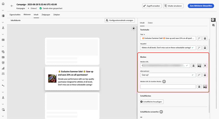 Sobald Ihr Inhalt definiert und personalisiert ist, können Sie ihn überprüfen und aktivieren. Ihre Kampagne wird entsprechend dem festgelegten Zeitplan gesendet. Weitere Informationen finden Sie auf dieser Seite.