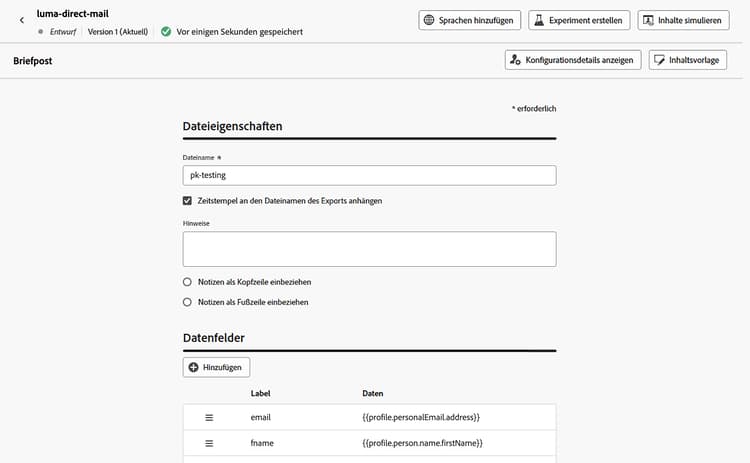 Bei der Erstellung einer Direkt-Mail-Nachricht generiert Journey Optimizer automatisch eine Datei, die alle Zielgruppenprofile und ausgewählten Daten enthält, z. B. Postanschriften und Profilattribute. Diese Datei wird an den Server Ihrer Wahl gesendet, sodass der von Ihnen gewählte Direkt-Mail-Anbieter darauf zugreifen kann, der den eigentlichen Mailing-Prozess für Sie übernimmt.